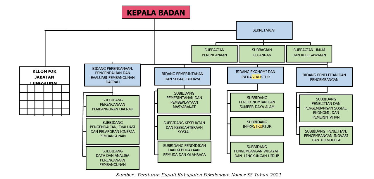 Susunan Organisasi Badan Perencanaan Pembangunan Daerah dan Penelitian dan Pengembangan Kabupaten Pekalongan terdiri dari :