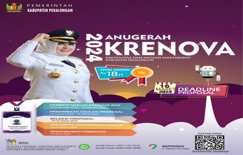 Ayo, sertai Lomba Inovasi KRENOVA 2024 diKabupaten Pekalongan! Bersama-sama, kita bisa menciptakan terobosan-terobosan baru yang mendorong perubahan signifikan dalam kehidupan masyarakat. Tak peduli apakah Anda masyarakat umum Kabupaten Pekalongan, akademisi, mahasiswa, pelajar, atau dari berbagai lapisan masyarakat lainnya, ide dan kontribusi Anda sangat berarti. Jadilahbagian dari gerakan inovasi ini dengan mengirimkan proposal Anda sebelum tanggal 16 Maret 2024. Mari bersama-sama menciptakan masa depan yang lebih baikuntuk Kabupaten Pekalongan!
